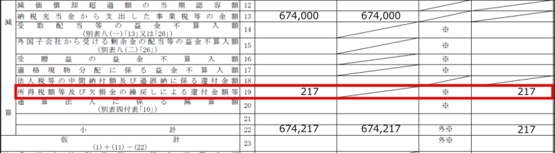 【減算欄】所得税額等及び欠損金の繰戻しによる還付金額等=(19)欄