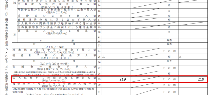 法人税額から控除される所得税額(29)欄には、受取利息や受取配当金に係る源泉所得税の金額を記載します。