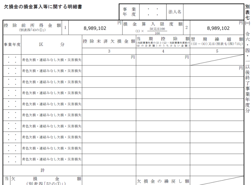また、欠損金の繰越控除の適用には、別表七という書類も必要です。
