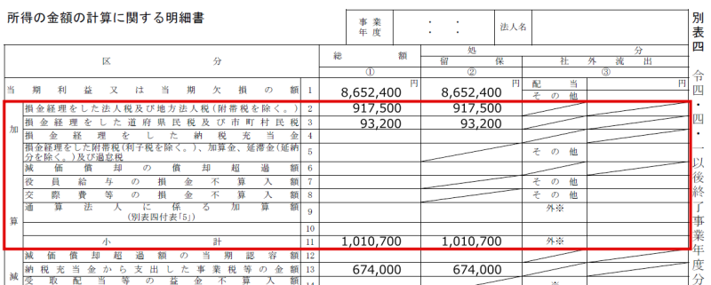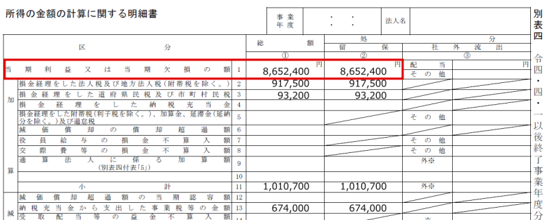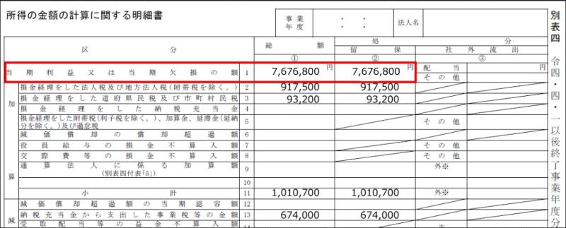 会社の決算書の当期純利益(赤字の場合は当期純損失)を別表4の一番先頭区分の(1)番(別表にはかっこはついてませんが、便宜上番号にかっこをつけます。)の総額欄と処分欄の留保欄に記載します。法人税の計算はこの当期純利益からスタートします。