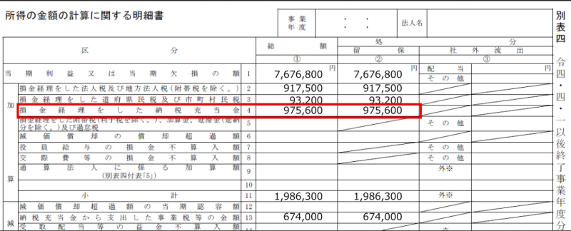 当期利益又は当期欠損の額(1)欄の金額を変更したので、このままでは所得金額がその分だけずれることになり、税額が変わってしまいます。そこで975,600を加算欄の損金経理をした納税充当金(4)欄に記載します。この記載をすることで、法人税等の会計処理をする前の所得金額8,989,102となり先ほど一致することになります。もちろん税額も先ほどと一致しています。