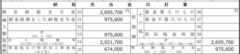 納税充当金から支出した事業税等の金額は、前期に法人税等が発生し「未払法人税等」を設定し、当期において、前期確定分の法人税等を未払法人税等を取り崩して納付をした場合に記載します。事業税及び特別法人事業税の合計額(設例では492,000+182,000=674,000)となります。