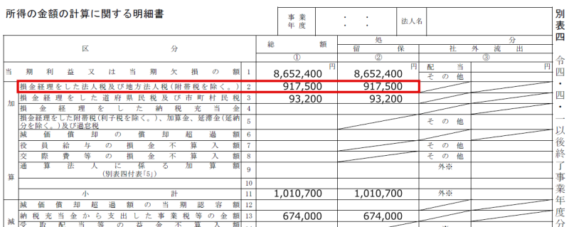 会計帳簿には中間申告分の納付が記帳されているはずですので、中間申告分の法人税と地方法人税の金額の合計額(831,900+85,600=917,500)を総額欄と留保欄に記載します。今回中間分の会計処理は「法人税、住民税及び事業税」で費用処理しています。「租税公課」などの費用科目でも同じです。
