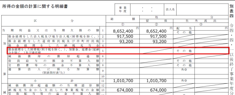 ただし、(5)欄の総額欄と社外流出(その他)欄ににはこれらペナルティをすべて記載するではなく、事前に税務署等に納期限延長を申請して遅れた場合に課される利息的な性格である「利子税」や「延滞金」は除かれますので記載しません。