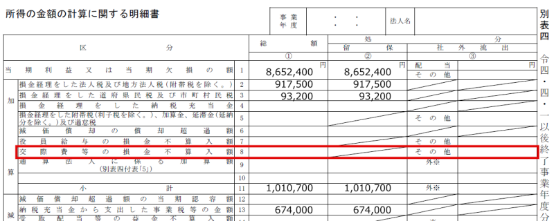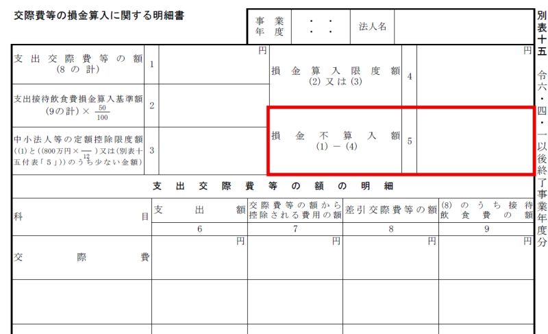 交際費等の別表十五という書類で計算した結果、損金不算入額がある場合に記載します。