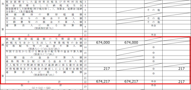 仮計(23)欄には、当期利益又は当期欠損の額(1)+加算欄の小計(11)+減算欄の小計(22)の合計金額を入れます。