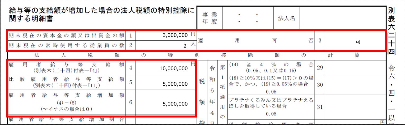 4・5欄は上記別表六(二十四)付表一の金額をそれぞれ転記します。6欄で給与の増加額を差額で求めます。