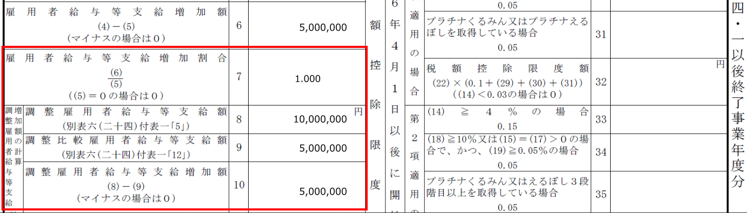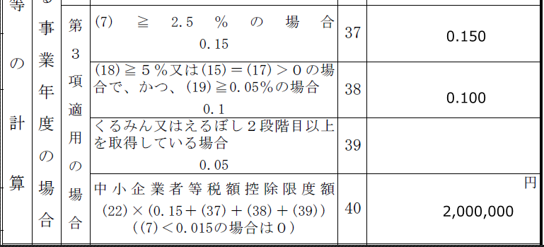 今回は、7欄が1.000(100%)増加しているため、通常要件である1.5%以上はもちろんのこと、上乗せ要件である2.5%以上もクリアしているため、0.150(15%)の税額控除が上乗せされます。
