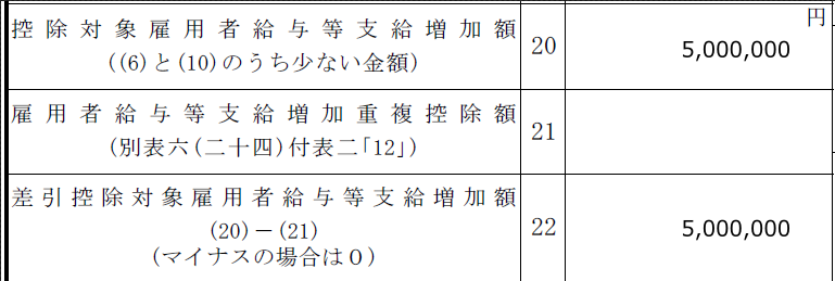 20欄~22欄を埋めます。税額控除の対象となるのは、雇用者給与等支給増加額と調整雇用者給与等支給増加額とのいずれか小さい方が限度となります。