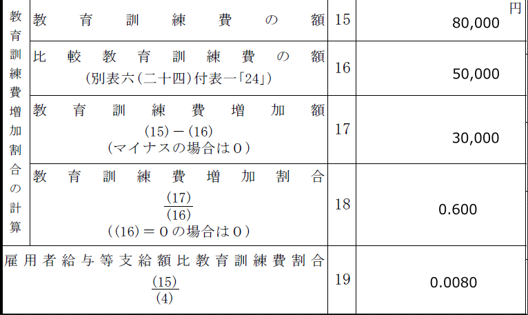15~19欄を埋めます。15欄には当年度の教育訓練費の額を入れ、16欄はすでに作成済みの別表六(二十四)付表一から転記します。