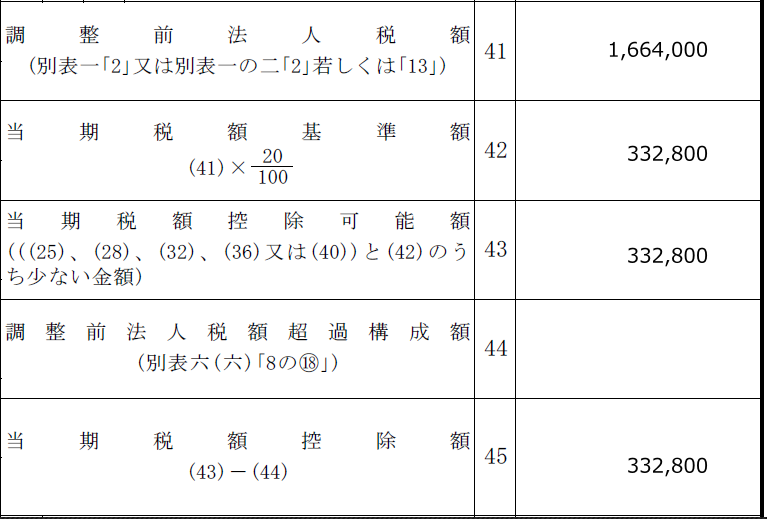 40欄で求めた500万円×40%=200万円を全額控除ができるわけではなく、当年度の法人税額の20%相当額が限度となります。41欄に当期発生の法人税額を記載し、42欄で当期税額基準額を記載し、43欄でいずれか小さい方が税額控除の対象額となります。